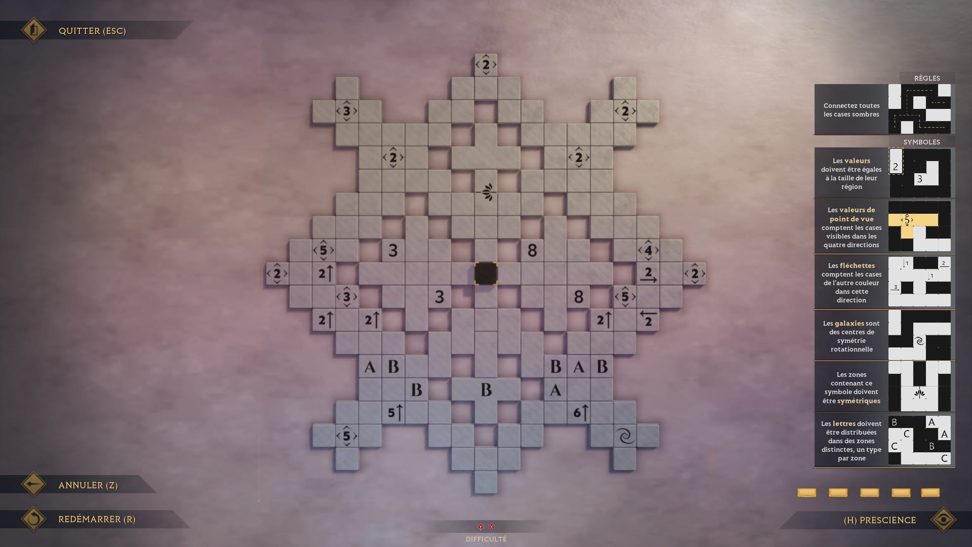 Certains puzzles dits "abstraits" se présentent sous la forme de grilles logiques, de match 3, de taquin, de mélodies à reproduire, etc. Ce sont des puzzles assez classiques que vous avez déjà rencontrés dans d'autres jeux. Dans cette catégorie, mes préférés sont ceux à base de cases blanches et noires : les règles à suivre pour remplir les cases de chaque grille changent constamment (ne pas dessiner telle forme, faire en sorte que toutes les cases d'une même couleur soient connectées, créer des formes symétriques, déduire un motif de cases déjà remplies, etc.). Ses règles se combinent les unes aux autres pour créer des grilles toujours plus stimulantes.
