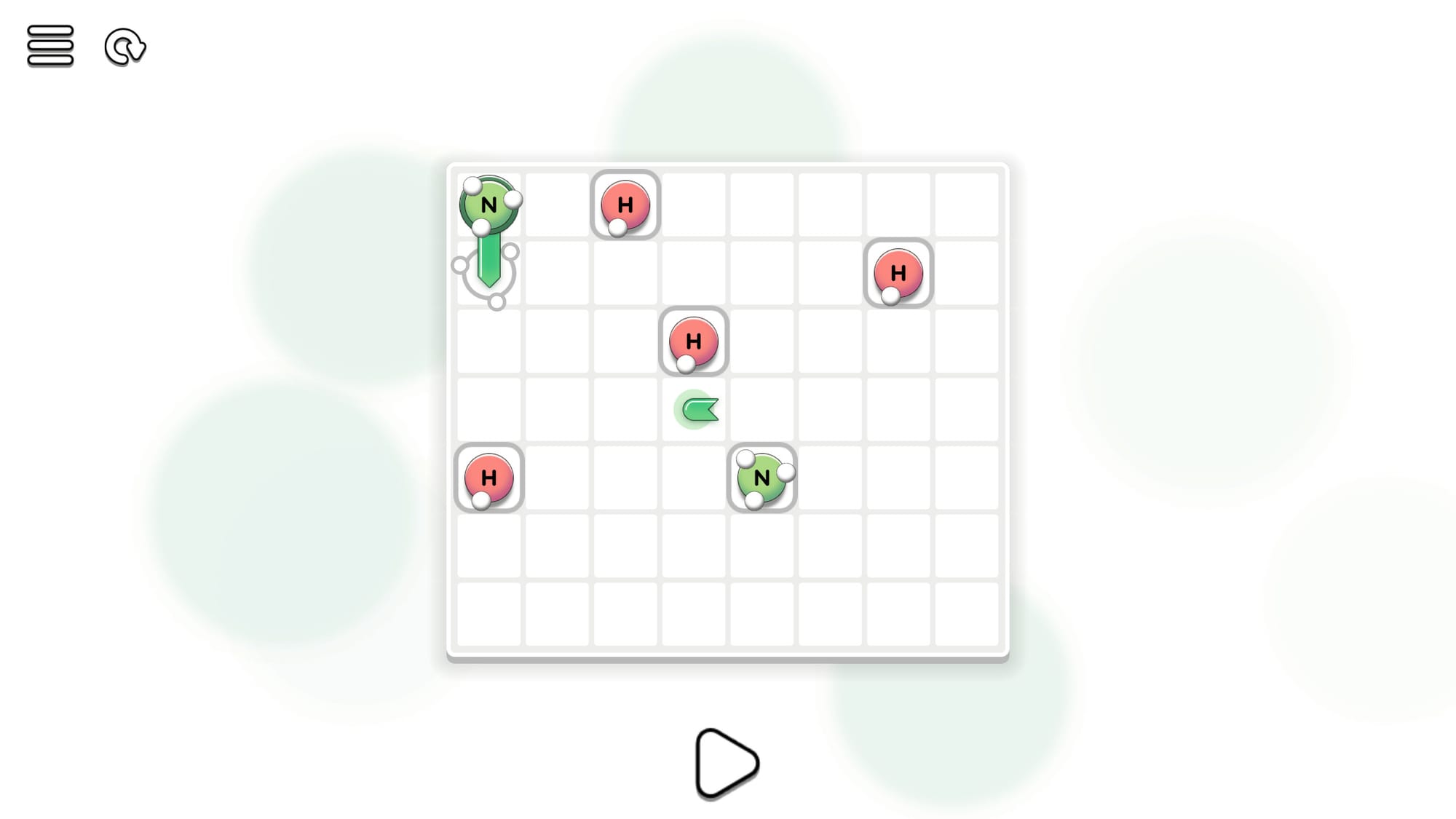 Les atomes CHON, des disques colorés, sont disposés sur une grille. Autour de ses atomes gravitent des points blancs qui indiquent combien de connexions ces atomes peuvent posséder : 1, 2, 3 ou 4. Lorsqu'un atome passe près d'un autre, ils se connectent automatiquement en consommant autant de points blancs / de connexions que nécessaire. Votre objectif consiste à connecter tous les atomes d'un même niveau entre eux pour former une molécule et à l'acheminer à un point de destination.